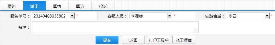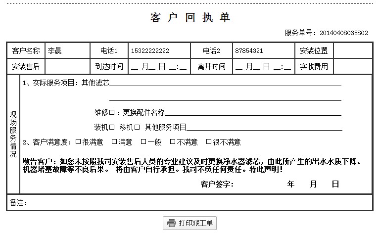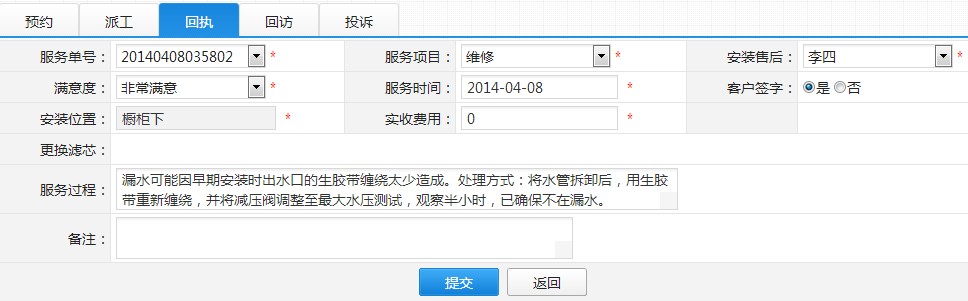 第五步:上门师傅工作完成,回来后将回执单给客服人员填写回执,如下图回执页面: