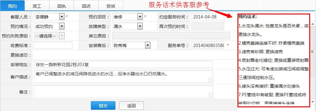 第二步:如下图进入派工服务流程页面,客服人员可以先根据“预约话术”与客户沟通,首先尝试通过电话指导排除故障。不能排除的故障则尽可能询问客户现场状况,以便上门师傅携带相应工具或配件;