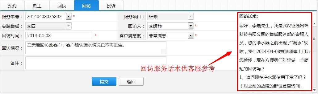 第六步:三天后,水事易系统会自动提示客服人员给客户做个回访确认,以了解服务完成情况,以及客户真实满意度,下图右边还提供客服人员可参考的回访话术
