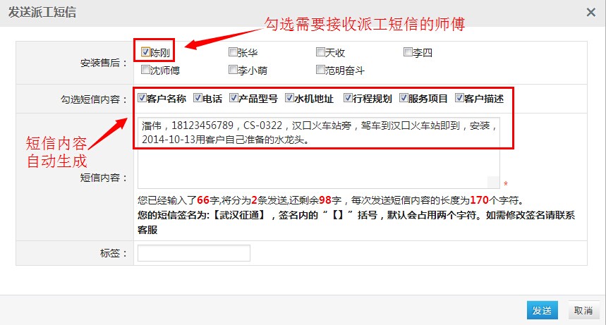 派工短信则方便客服人员将派工任务通过手机短信发送给不在公司的师傅们。比如师傅们一早都在外面忙,需要您安排其中一位去解决客户家漏水问题,碍于用手机操作发短信麻烦,或者师傅在车上不便于笔纸记录,则可用派工短信功能,可将客户基本信息和服务请求短信,发送到指定的师傅手机上。如下图:
