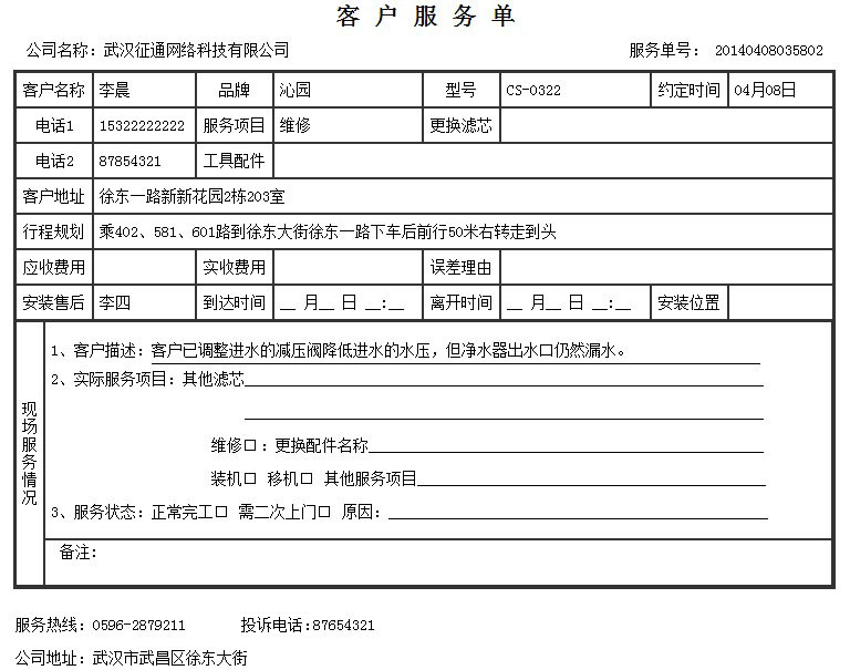 友情提示:上图裁剪线以上部分填写完毕后交给客户留存,下半部分“客户回执单”需要客户签名并勾选满意度,由师傅带回交给客服人员录入系统。