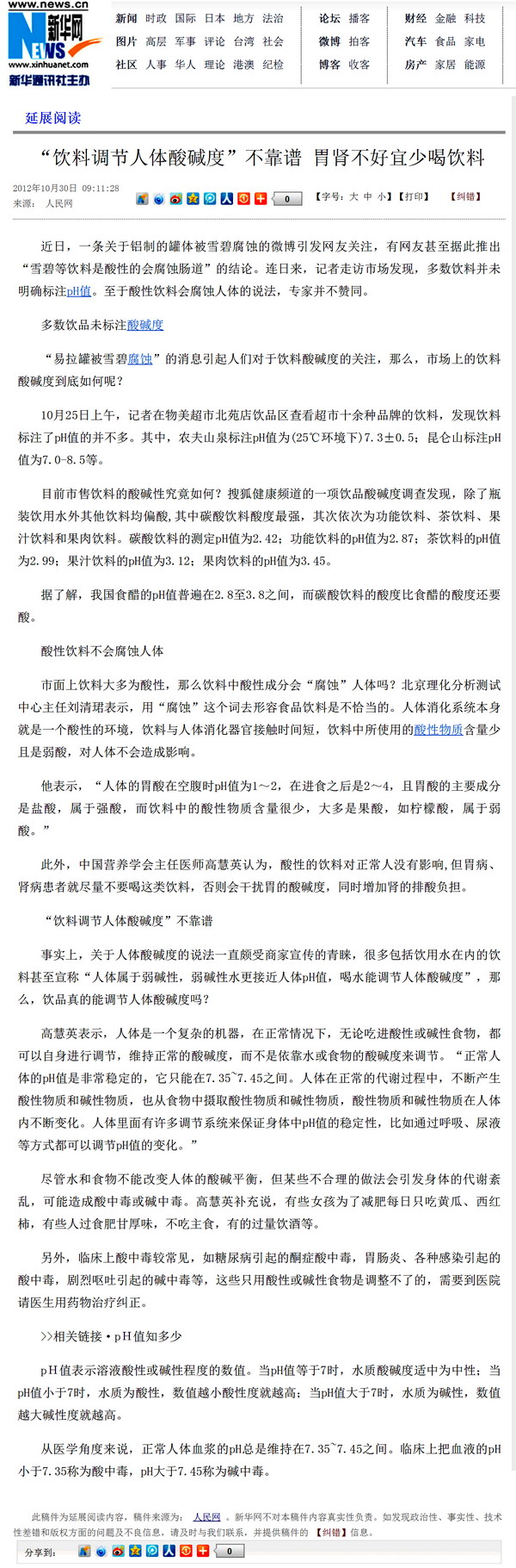 剪报图片:新华网 饮料调节人体酸碱度 不靠谱 胃肾不好宜少喝饮料